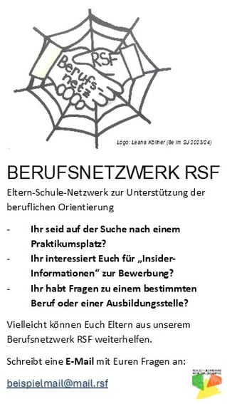 Dieser Gedanke ist Kern der Idee "Berufsnetzwerk RSF", die schon vor einigen Jahren aus der Elternschaft der Realschule Freiham an die Schule herangetragen wurde. Schritt für Schritt wurden die Grundlagen geschaffen, u.a. eine E-Mail-Adresse für das Netzwerk eingerichtet, eine Logo durch Schülerinnen und Schüler der RSF entwickelt, zum Austausch im Rahmen von Informationsveranstaltungen eingeladen. Es freut uns sehr zu beobachten, dass das Angebot immer mehr genutzt wird: Schüler haben sich auf der Suche nach Praktika an das Netzwerk gewendet, Eltern bieten Workshops zum Thema "Recruiting" für die Schülerinnen und Schüler der RSF an, über das Netzwerk können Eltern mit Fragen zu den verschiedensten Ausbildungsberufen von Schülern kontaktiert werden.
